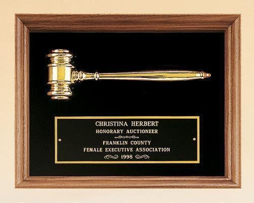 American walnut frame with a gold electroplated metal gavel on black velour background. Laser engravable solid brass engraving plates. Individually boxed.