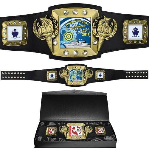 We've got the perfect award for a true champion! Constructed of vegan leather, the Victory Champion Award Belt measures 52" long and has a 4.25" x 4.25" center plate that features 3D victory torches on either side of the plate and two 2" x 2" side plates with a total of 32 clear synthetic stones. Each belt comes with three customized Insert label printed with the Vibraprint process and poly dome and a satin lined presentation box. Perfect for graduation, athletic competitions, top performers and many other events!