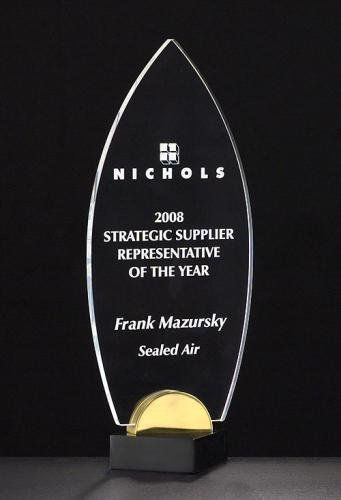 Affordable and elegant. 3/8" thick acrylic upright with flame design on black and gold base. Clear only. Individually gift boxed.