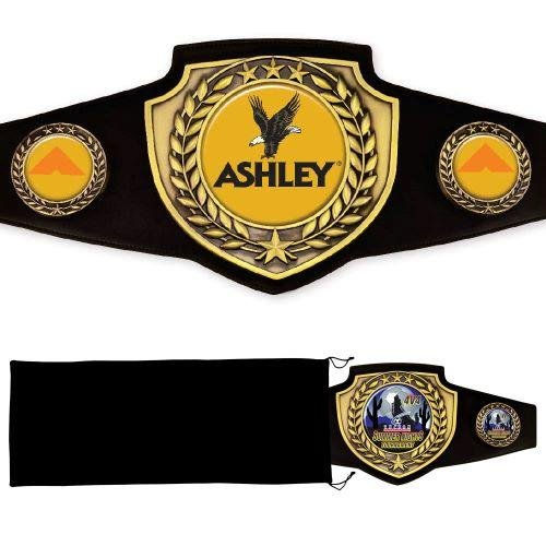 Perfect for recognizing top salesmen and others that deserve recognition, this antique gold award belt with vegan black leather can be customized with up to 3 custom emblems. Measuring 52" long with heavy-duty snaps, this belt showcases an 8" x 7" main plate in gold and silver plating with white or black leather. Customize this stunning award with customized Insert label printed with the Vibraprint process and poly dome in a black presentation pouch.